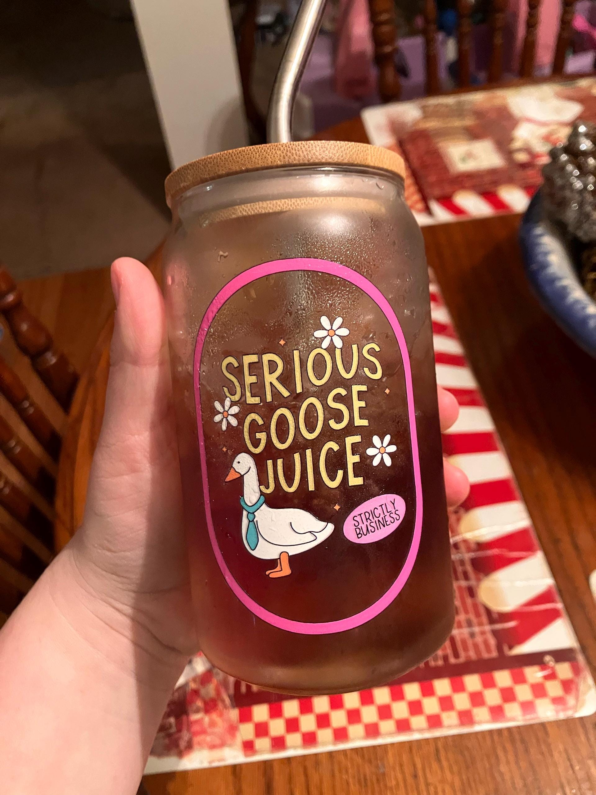 Surprise your friends/bridesmaids/bridal party with this funny Serious Goose Juice Glass Can Tumbler. These tumblers are the perfect birthday and holiday gift! You can purchase the glass tumbler only or include the bamboo lid & metal straw!